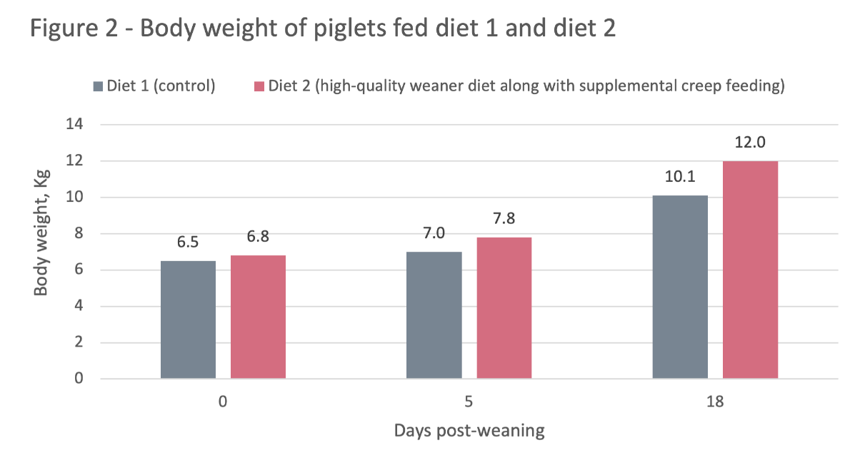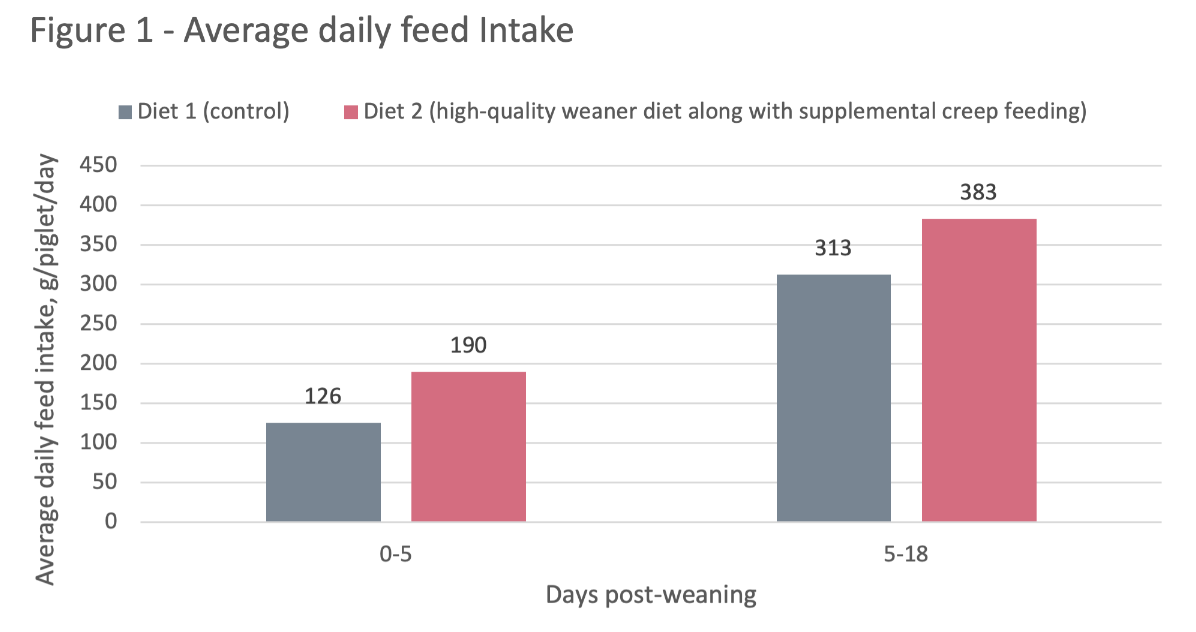 The goal of supplemental creep feeding should go beyond simply adding body weight to the animal. Creep feeding should also aim to stimulate and sustain the weaning piglet’s feed intake in an effort to deliver lasting performance benefits. In the trial, pigs receiving the creep feed and premium weaner diet showed a significantly greater feed intake and feed efficiency during the first 18 days post-weaning.